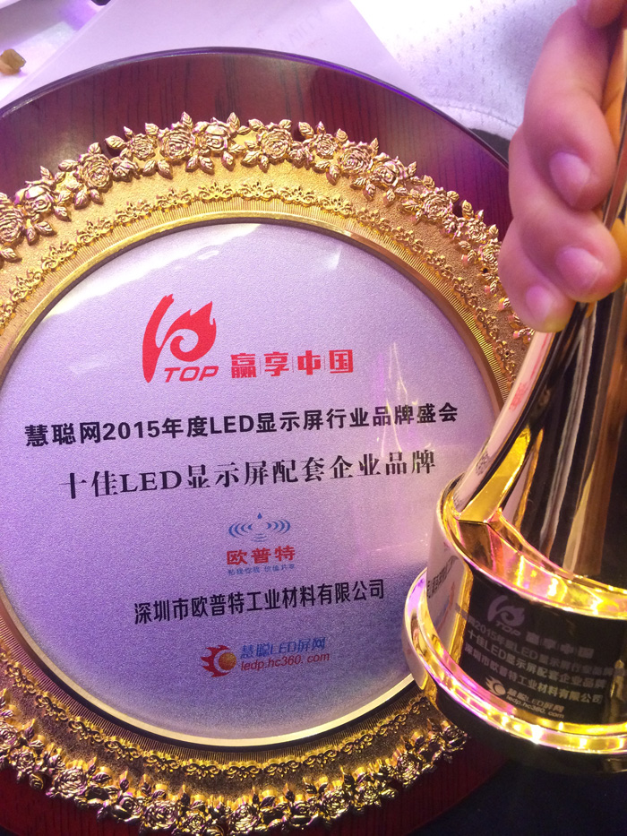 贏享中國.強(qiáng)力巨彩杯2015年LED顯示屏行業(yè)高峰論壇暨頒獎盛典12月15日在深圳西麗麒麟山莊順利召開。恭喜得獎的各位行業(yè)大伽及企業(yè),同時也恭喜深圳歐普特工業(yè)材料有限公司獲得十佳LED顯示屏配套企業(yè)品牌