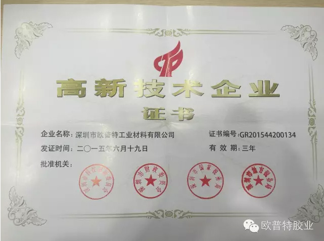 2015年6月19日,深圳市歐普特工業(yè)材料有限公司榮獲由深圳市科技創(chuàng)新委員會(huì)、深圳市財(cái)政委員會(huì)、深圳市國(guó)家稅務(wù)局及深圳市地方稅務(wù)局聯(lián)合頒發(fā)的“國(guó)家高新技術(shù)企業(yè)”證書(shū)。證書(shū)編號(hào)為GR201544200134。此次榮獲國(guó)家高新技術(shù)企業(yè)證書(shū),是國(guó)家相關(guān)部門(mén)對(duì)歐普特技術(shù)創(chuàng)新能力和高端技術(shù)開(kāi)發(fā)能力的最好肯定,更預(yù)示著歐普特膠業(yè)創(chuàng)新技術(shù)已經(jīng)邁向更高臺(tái)階。