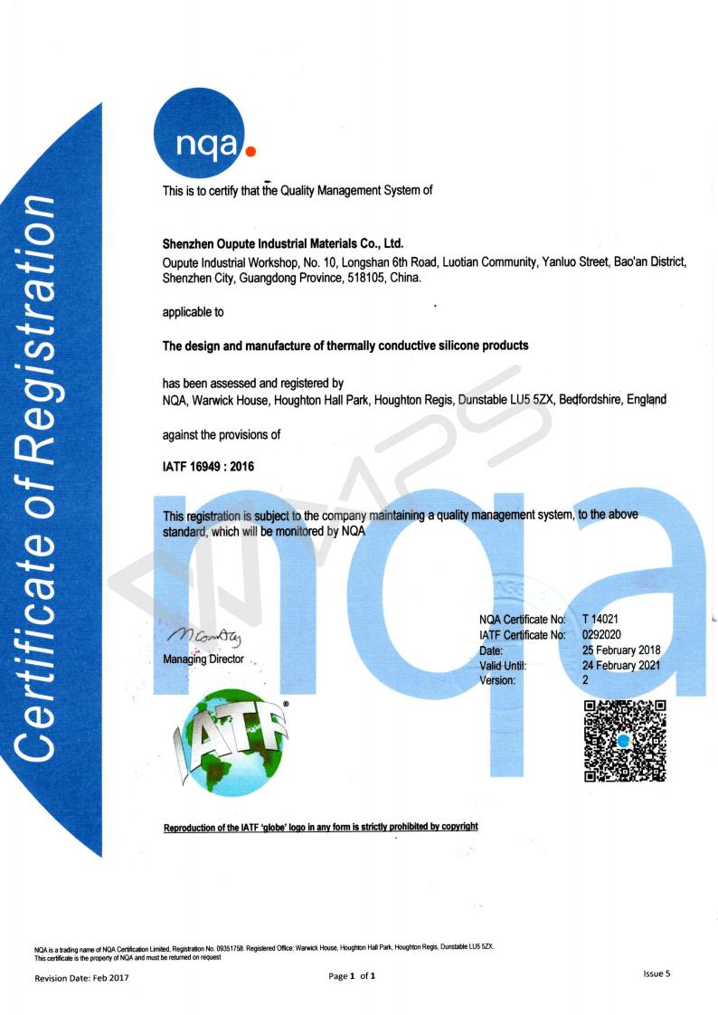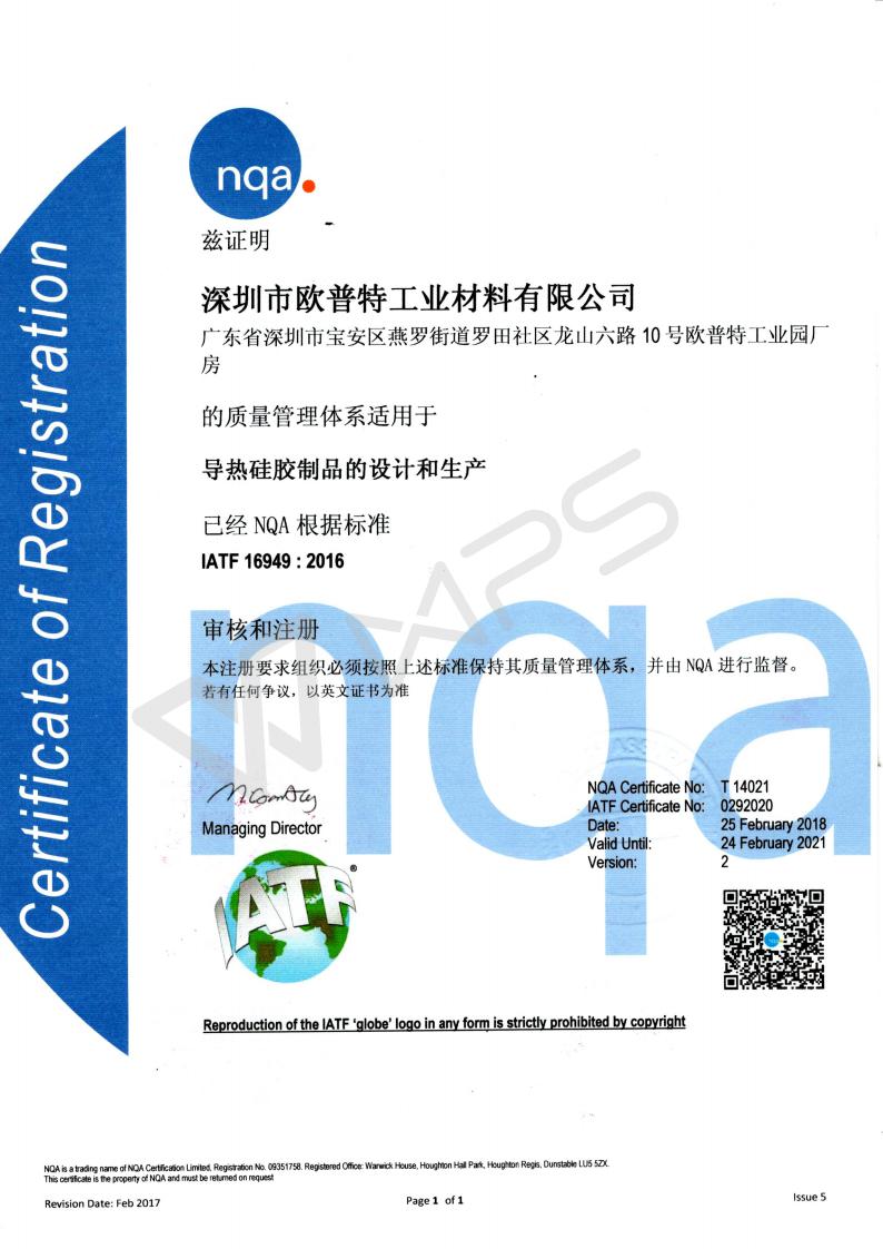 2018年1月,NQA認證機構(gòu)對我公司IATF16949質(zhì)量管理體系進行了為期3天的現(xiàn)場審核,經(jīng)過層層嚴格把關(guān),審核組認為深圳市歐普特工業(yè)材料有限公司的各項管理符合IATF16949的要求。2018年3月27日,NQA認證公司正式給公司頒發(fā)了IATF16949認證證書,這是公司繼2011年取得ISO9001質(zhì)量管理體系認證、2017年取得ISO14001環(huán)境管理體系后,公司在體系管理與建設(shè)方面取得的又一重要進展。該證書的取得,標志著公司的導熱硅膠獲得了進入汽車市場領(lǐng)域的綠色通行證,為公司積極開拓汽車用硅膠市場奠定了堅實的基礎(chǔ)。