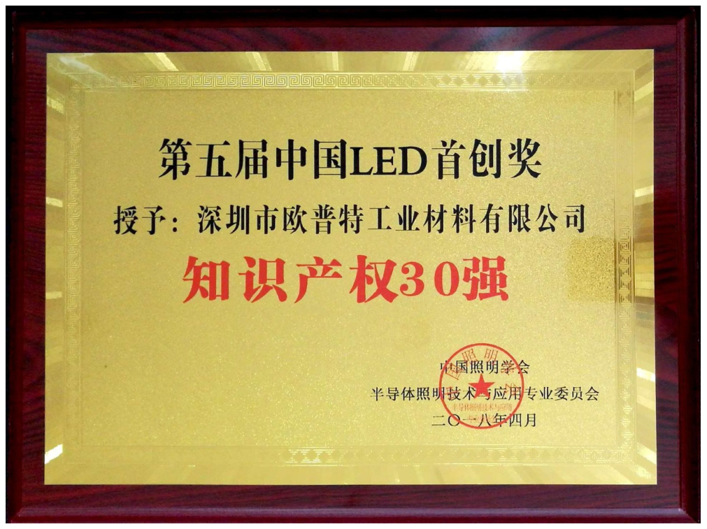 2018年4月26日,深圳市歐普特工業(yè)材料有限公司獲得由中國照明學(xué)會(huì) 半導(dǎo)體照明技術(shù)與應(yīng)用專業(yè)委員會(huì)頒發(fā)的“知識(shí)產(chǎn)權(quán)30強(qiáng)”證書,對我司取得的知識(shí)產(chǎn)權(quán)予以認(rèn)可。